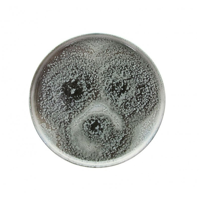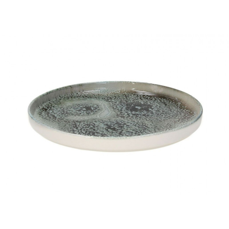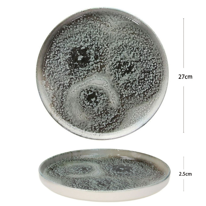 Piatto piano in gres della serie Caldera Grey Kaden, con smalto reattivo nei toni del grigio e blu. Ideale per servire secondi o piatti unici con un tocco di eleganza naturale.