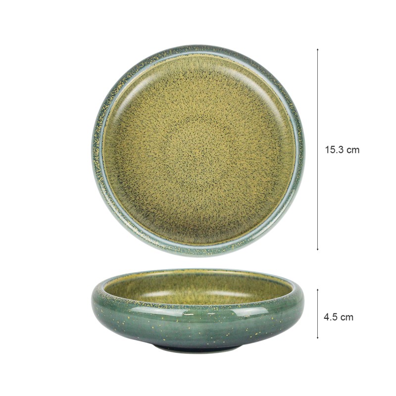 Piatto in ceramica 6.5" con effetto di cottura variabile, colore blu-verde misto. Realizzato in ceramina di alta qualità, con superficie smaltata lucida e bordi lisci. Perfetto per la decorazione domestica o come contenitore per oggetti di cancelleria.