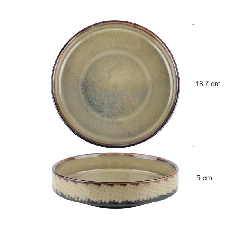 Piatto frutta in porcellana della serie Lagoon, con finitura verde acqua e bordo sottile brunito. Perfetto per servire frutta, dessert o antipasti con eleganza naturale.