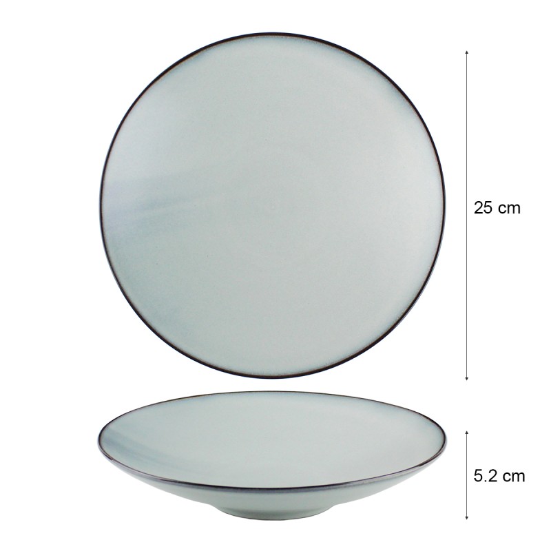 Questo piatto fondo in ceramica è realizzato con una finitura celadon minimalista, con un bordo nero opaco che crea un contrasto elegante e moderno.