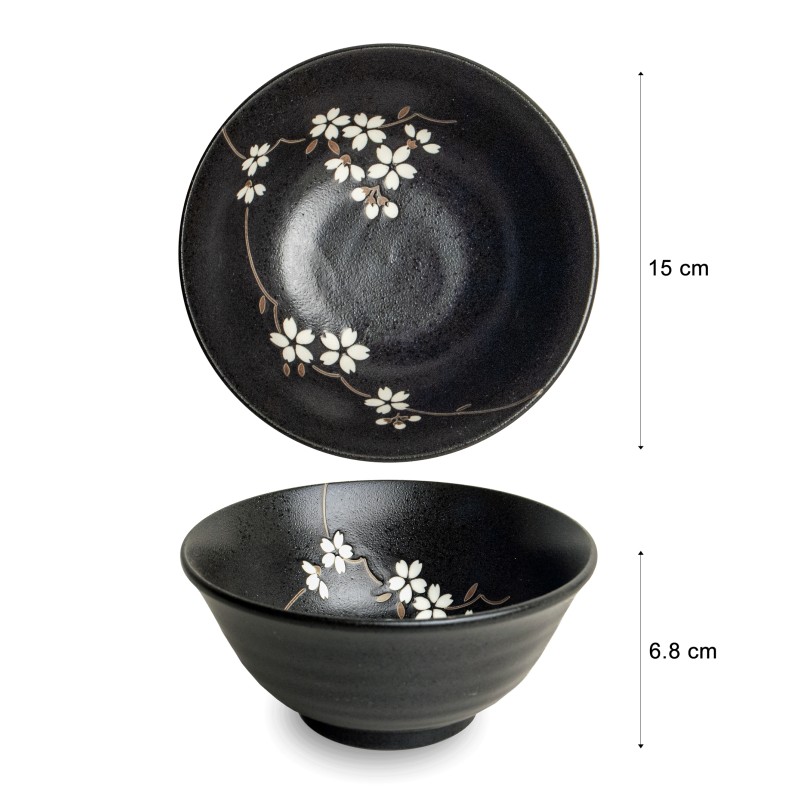 Ciotola in ceramica giapponese da 15 cm con finitura nero opaco e decorazione a fiori di ciliegio. Parte della Collezione Sakura. Perfetta per riso, snack, contorni e dessert.