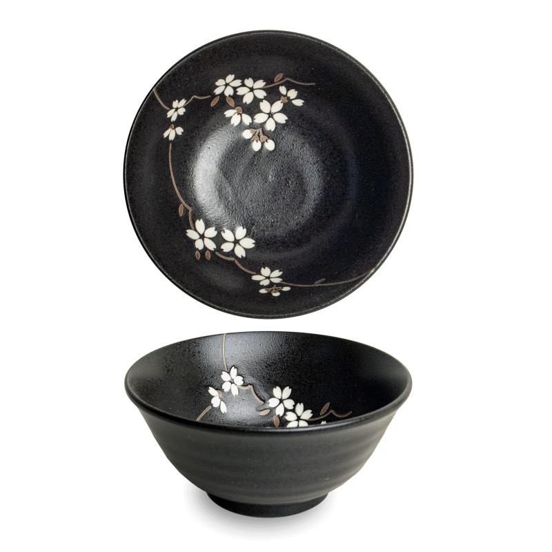 Ciotola in ceramica giapponese 19,5 cm con finitura nero opaco e decorazione a fiori di ciliegio. Parte della Collezione Sakura. Ideale per noodle, riso, zuppe e ramen leggeri.