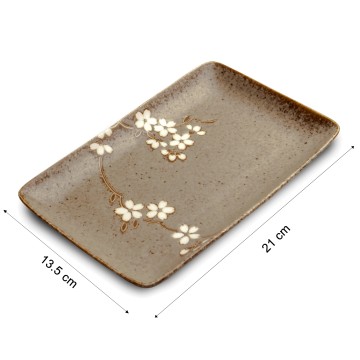 Elegante piatto sushi in gres color taupe con motivo di fiori di sakura, ideale per sushi, sashimi e antipasti. Dimensioni 21×13,5×H3 cm.