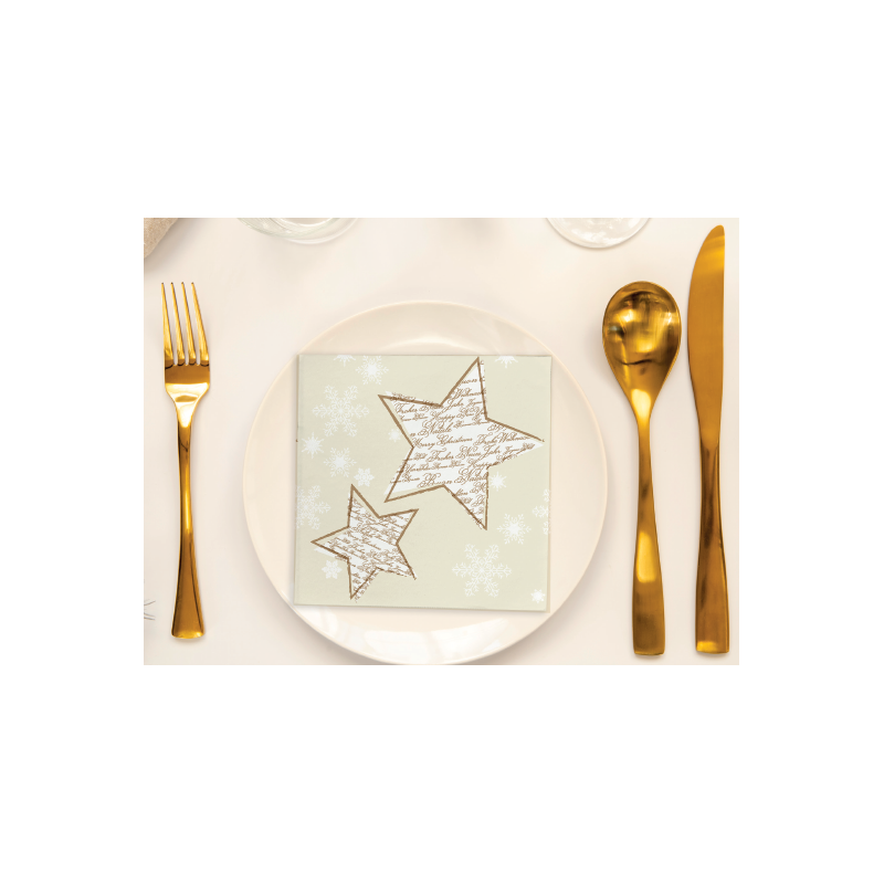 Il tovagliolo di carta natalizio Etoile Avorio 40x40 è pensato per creare una tavola elegante e calda durante il periodo delle feste. La decorazione con stelle dorate e delicate scritte ornamentali, accompagnate da fiocchi di neve bianchi, aggiunge un tocco raffinato e festoso a qualsiasi allestimento.