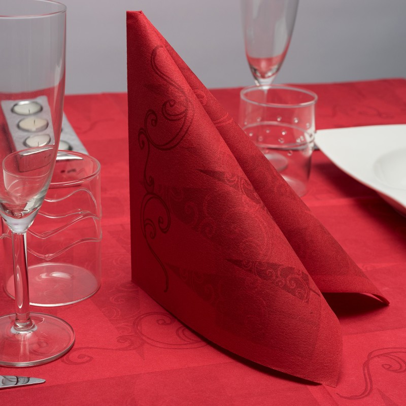 Tovagliolo natalizio rosso in carta, elegante e ideale per tavole festive. Formato 40x40 cm, perfetto per ristoranti ed eventi di Natale. Confezione da 50 pezzi.