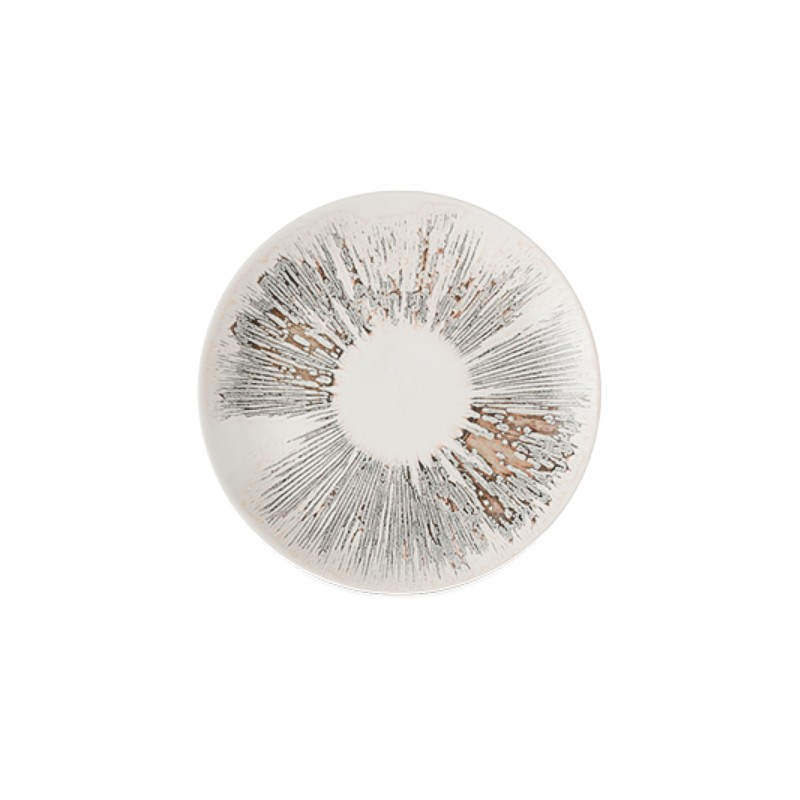 Piatto con bordo alto da 21 cm della linea Lume Natural, caratterizzato da una decorazione organica effetto luce dorata. Ideale per presentazioni eleganti di antipasti, dessert e piatti gourmet.
