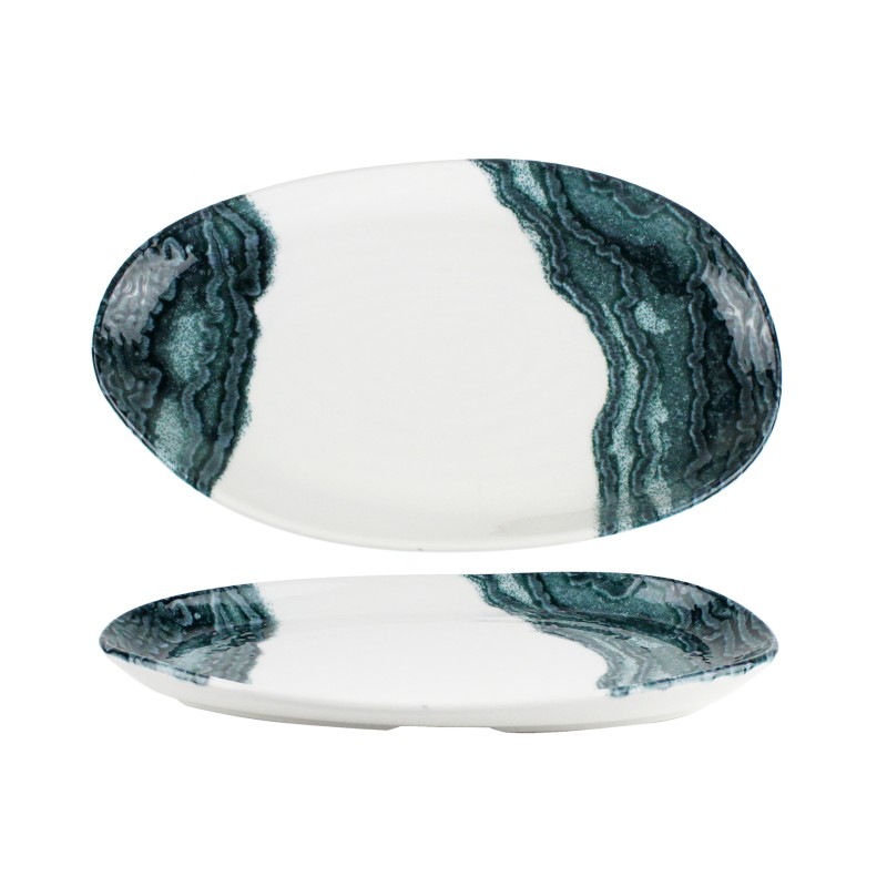Vassoio ovale 22×13 cm della linea Tide Black Natural, decorato con un elegante motivo marino in tonalità scure. Ideale per antipasti, finger food e piccole presentazioni.